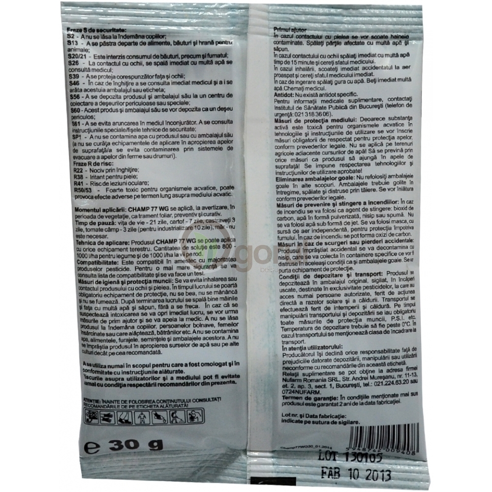 CHAMP 77 WG este un produs sub forma de granule disperabile in apa, de culoare albastru verzui, ce contine 50% cupru metalic sub forma de hidroxid de cupru.