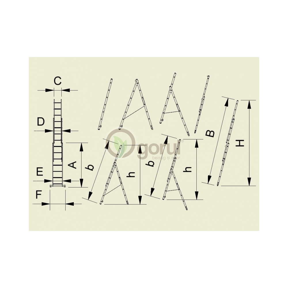 | Tip | Inaltime scara | Inaltime scara desfasurata | Inaltimea primelor doua tronsoane | Latime extensie/latime scara | Nr.trepte | Latime baza | Greutate |