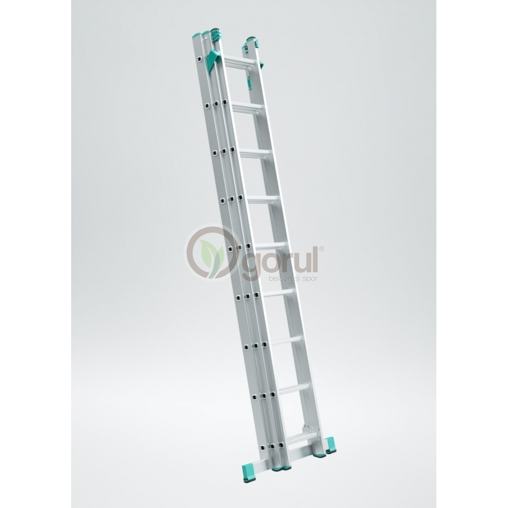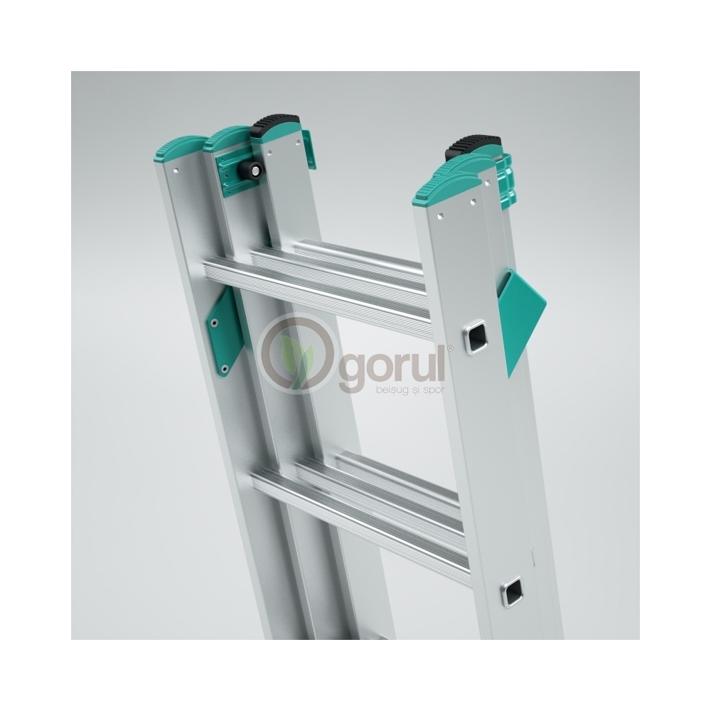 Scara universala cu trei tronsoane Eurostil, adaptabila pentru asezarea pe trepte, nr. trepte 3x9, lungimea extensibila maxima de 569 cm si latimea 45.4 cm.